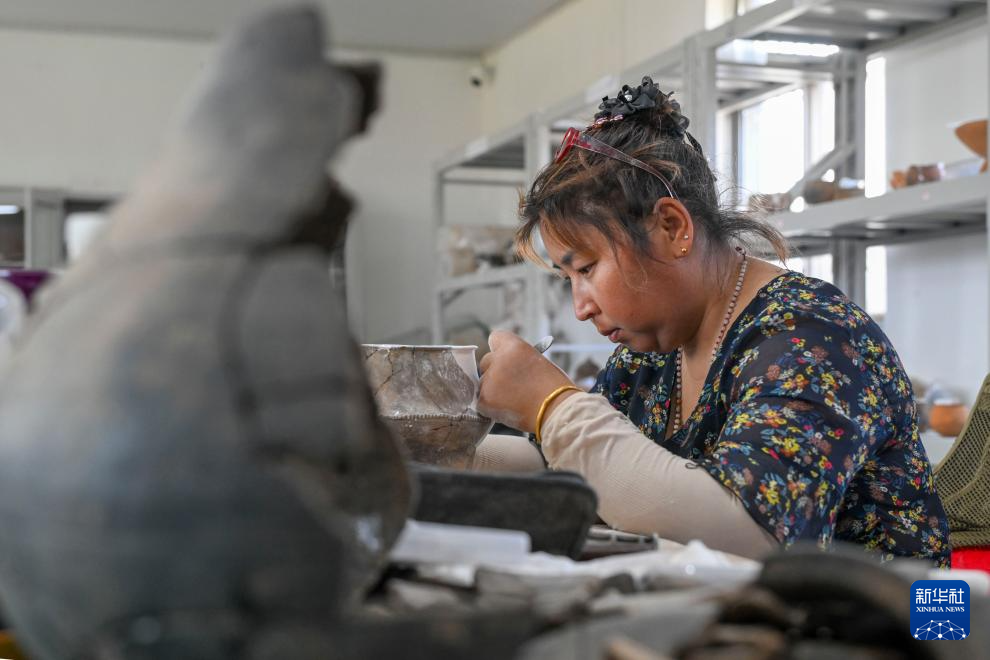 5月20日,考古工作者在大汶口遺址考古工作站對出土器物進行修復。