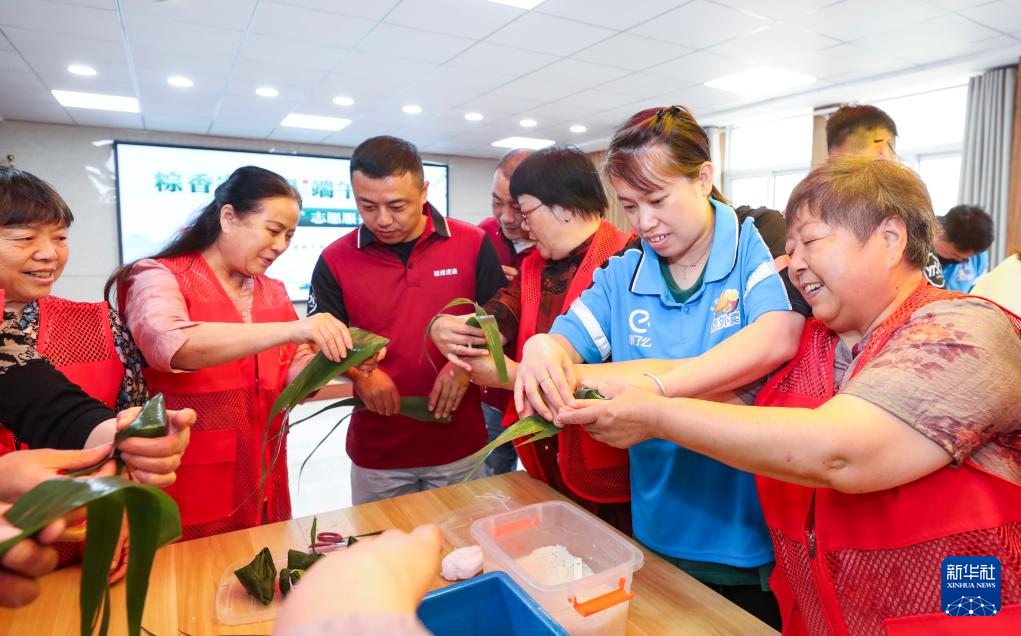 5月23日,江蘇省淮安經濟技術開發區的退休職工志愿者和快遞員一起包粽子。