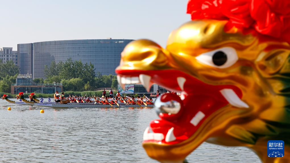這是5月24日在天津港保稅區空港西湖水域拍攝的龍舟競渡現場。