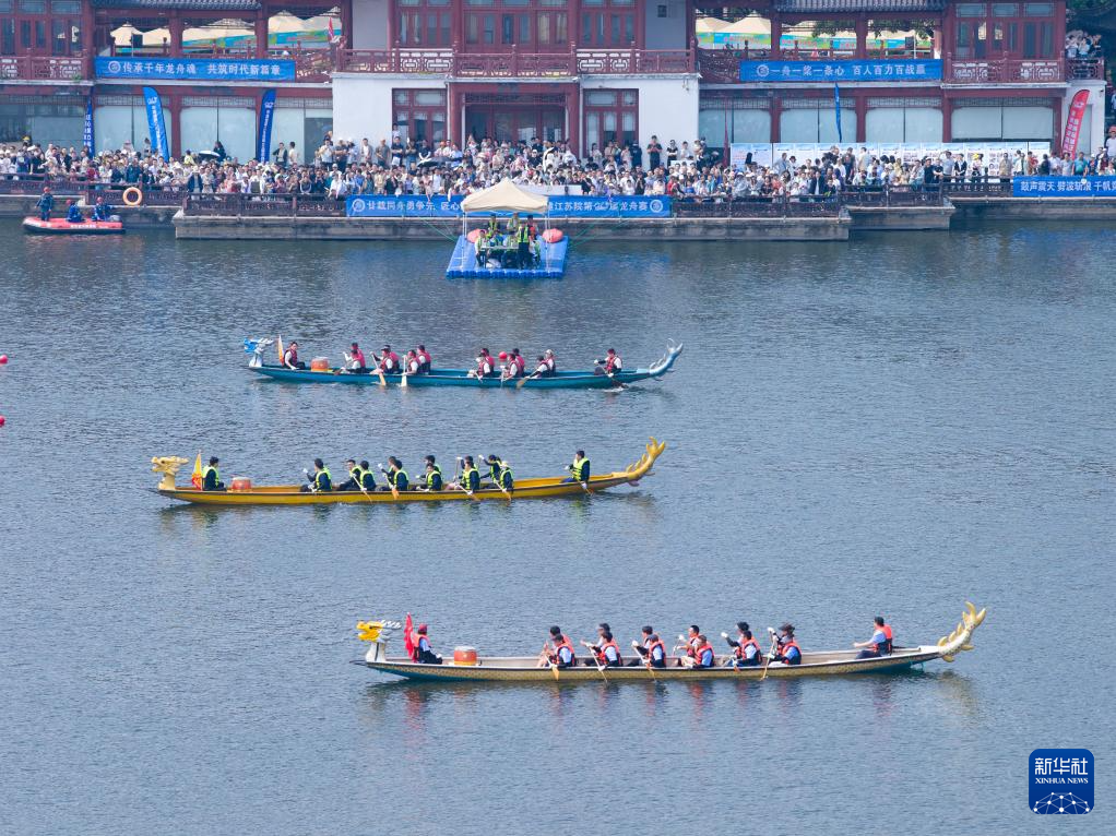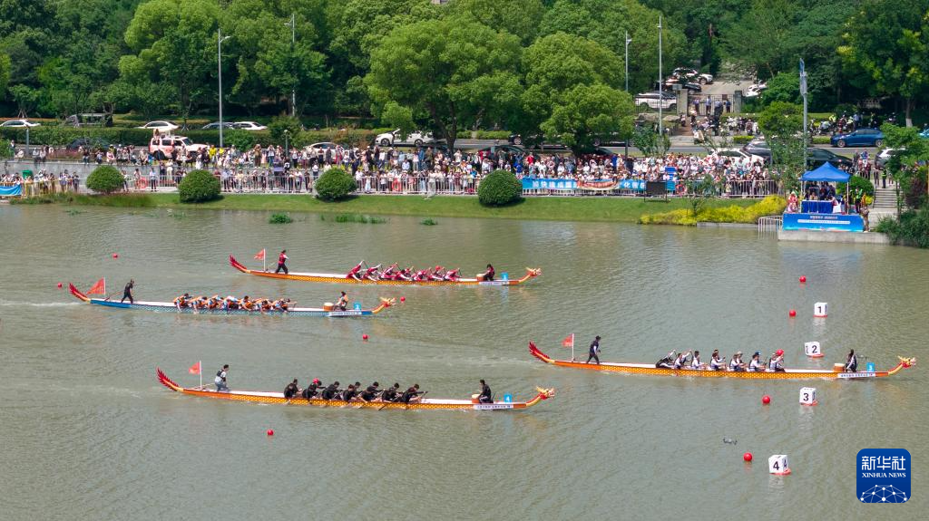 5月24日,龍舟隊在江蘇省南京市莫愁湖公園參加比賽(無人機照片)。