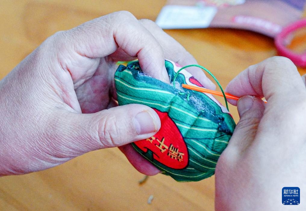 5月23日,志愿者在山東省榮成市新時代文明實踐中心制作香囊,準備送給孤寡老人。