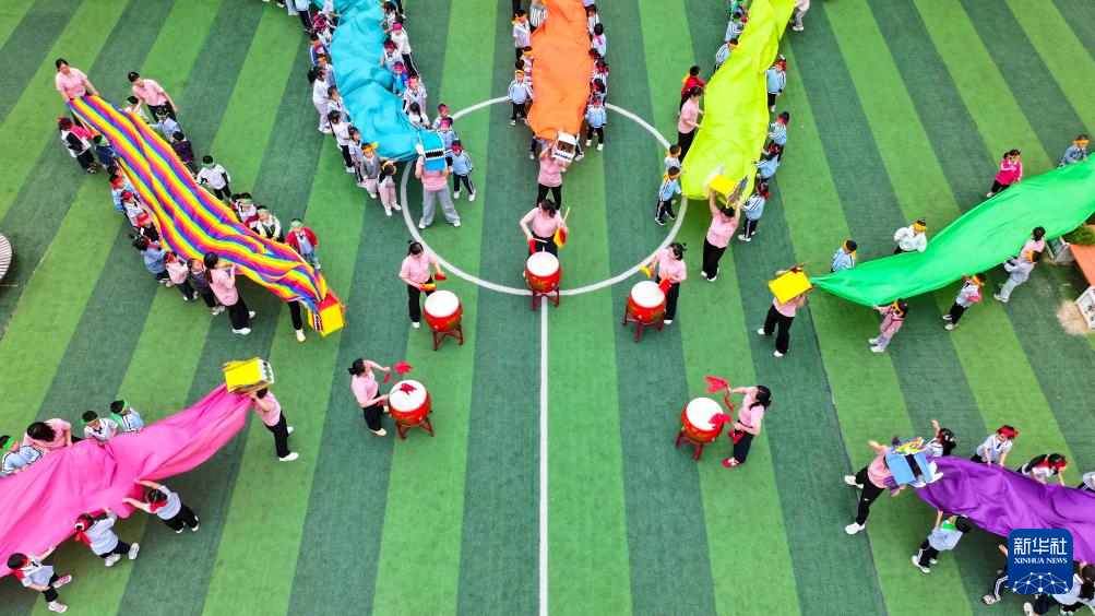 5月23日,在山東省東營市廣饒縣李鵲鎮中心幼兒園,小朋友在進行龍舟賽游戲(無人機照片)。