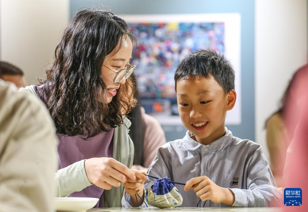 5月23日,在江蘇省句容市葛仙湖公園,小朋友與家長體驗香囊制作。