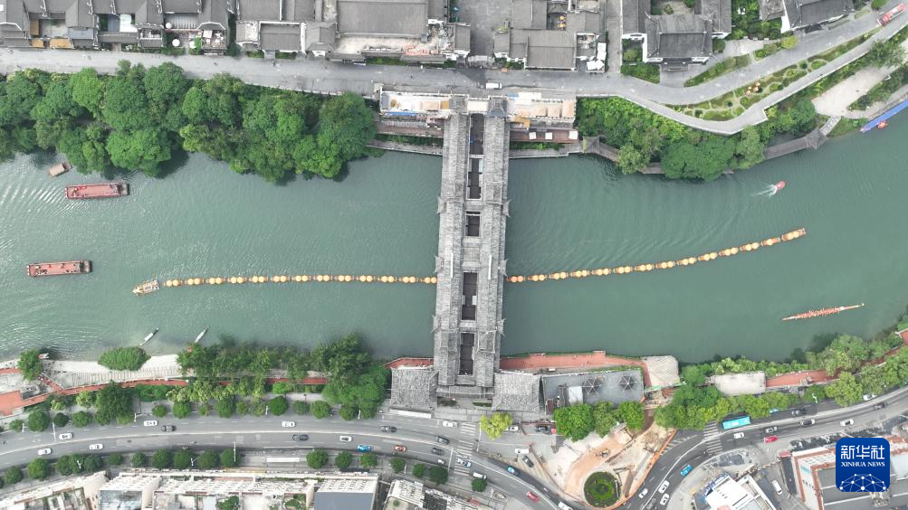 5月24日,在貴州省銅仁市碧江區錦江水域,觀光龍舟從風雨橋下穿過(無人機照片)。