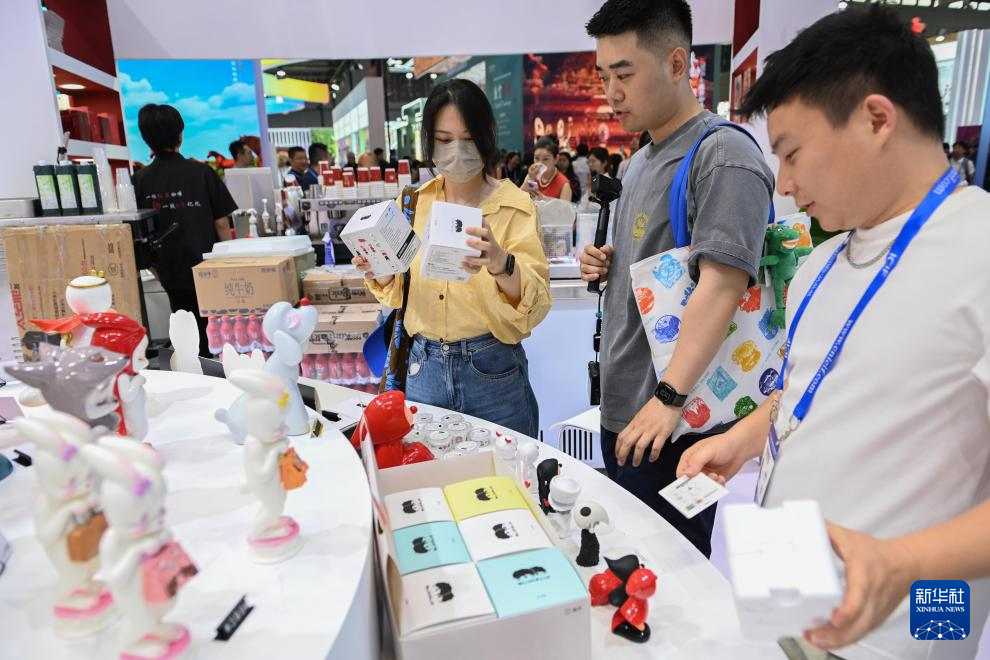 5月23日,人們在文博會“文創中國”展區選購三星堆文創產品。