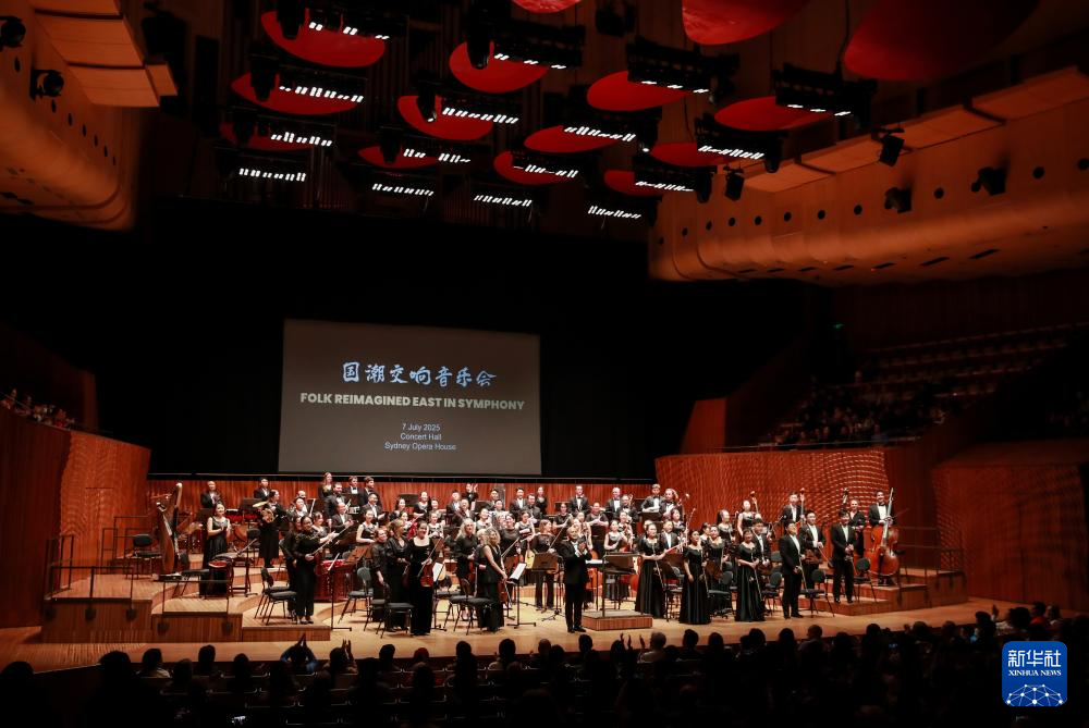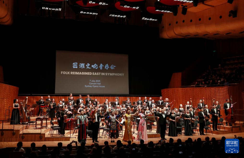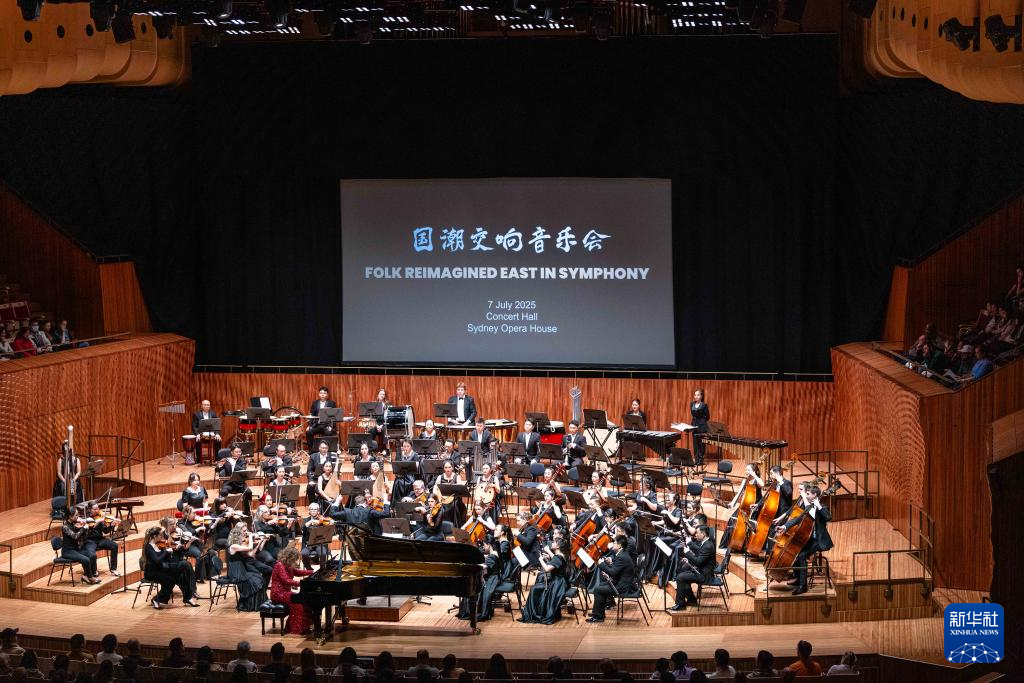 7月7日,在澳大利亞悉尼歌劇院,來自多彩貴州藝術團和澳大利亞管弦樂團的成員們在音樂會上演奏。