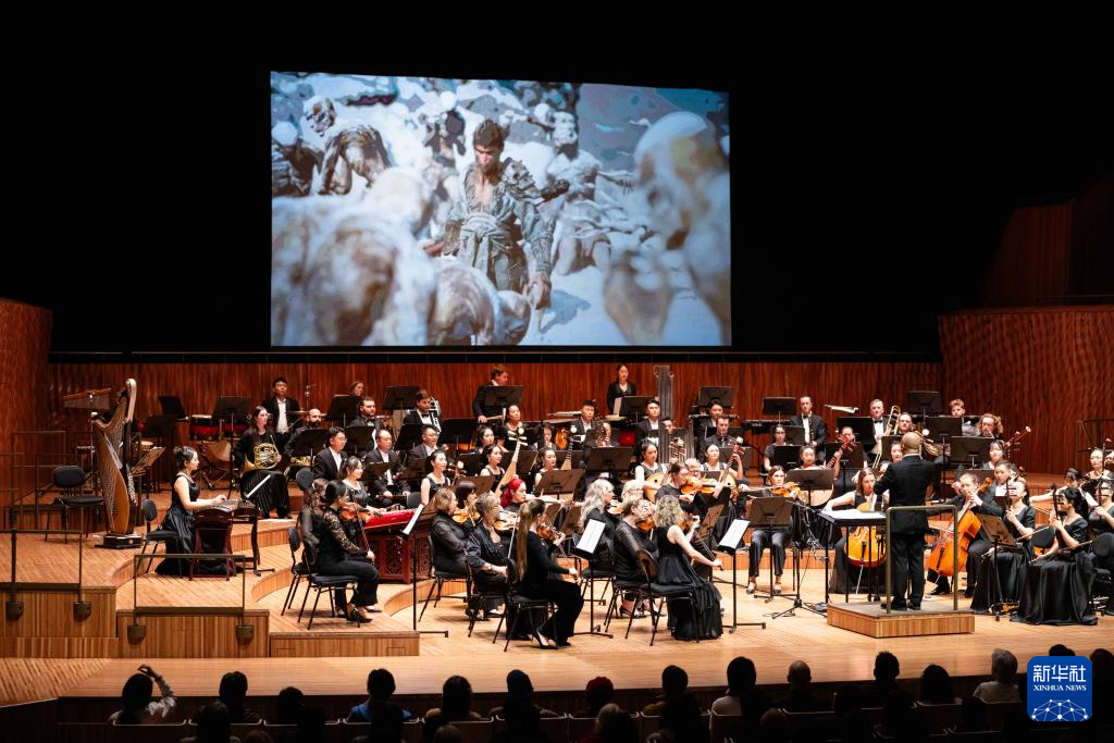 7月7日,在澳大利亞悉尼歌劇院,來自多彩貴州藝術團和澳大利亞管弦樂團的成員們在音樂會上演奏《悟空》。