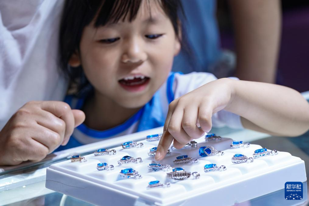 7月10日,小朋友在昆明石博會上幫家長挑選玉石。
