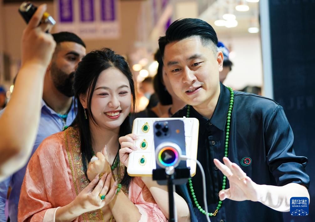 7月10日,兩名主播在昆明石博會上直播售賣玉石。
