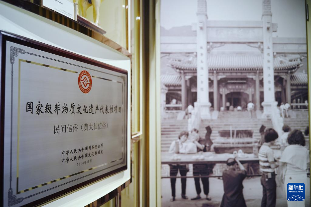 這是這是7月12日拍攝的香港黃大仙信俗文化館陳列的國家級非物質文化代表性項目牌匾及黃大仙祠老照片。新華社發(王申攝)
