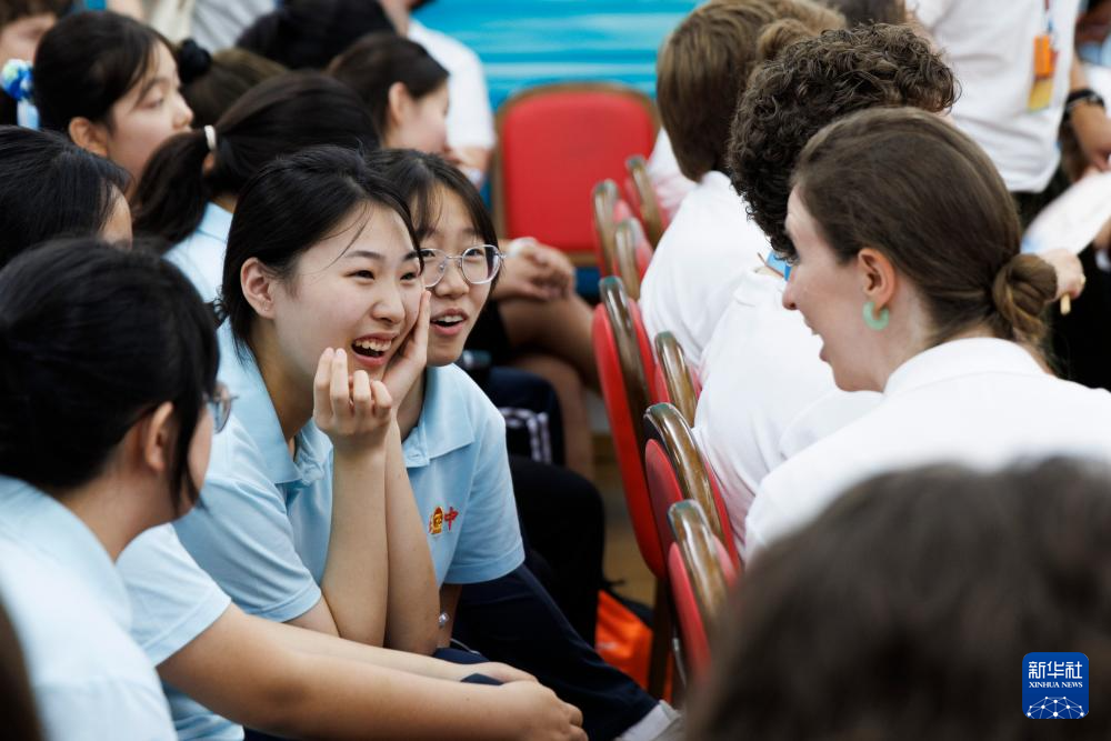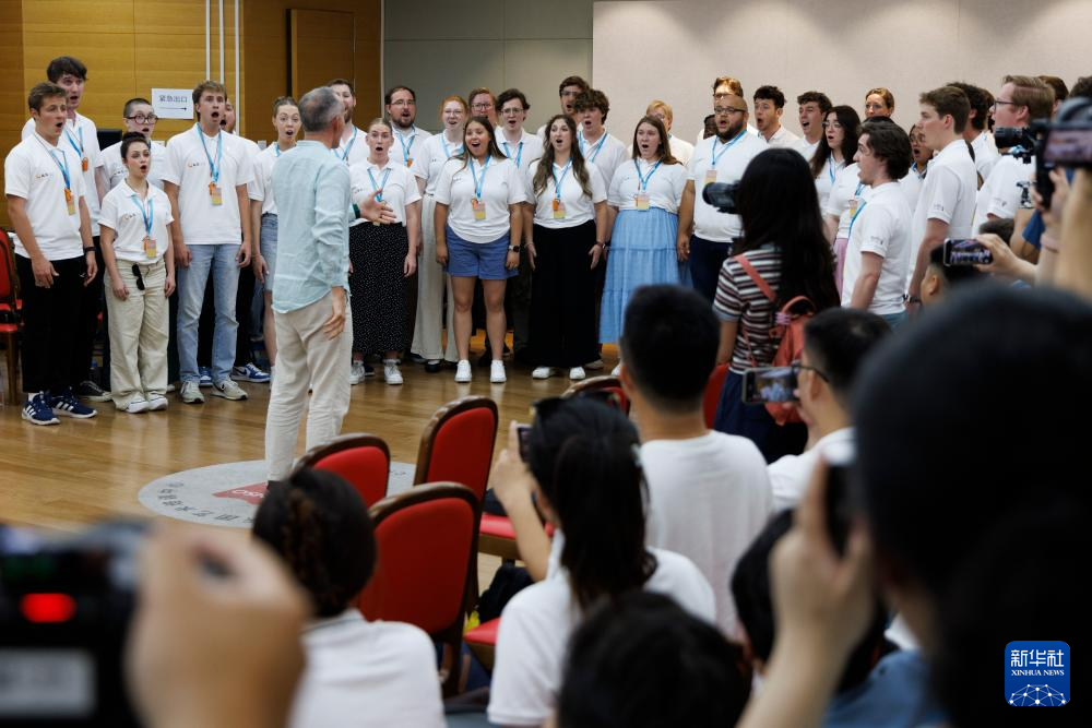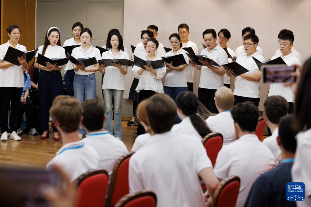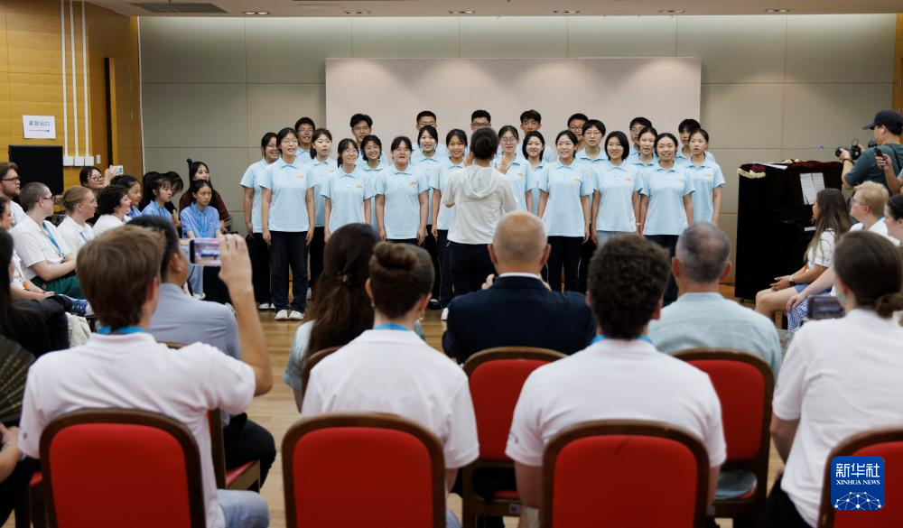 7月14日,在中國交響樂團,河北省正定中學合唱團團員與猶他谷大學合唱團團員交流。