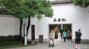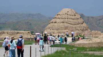 7月14日,游客在大汶口遺址博物館內參觀出土陶器。