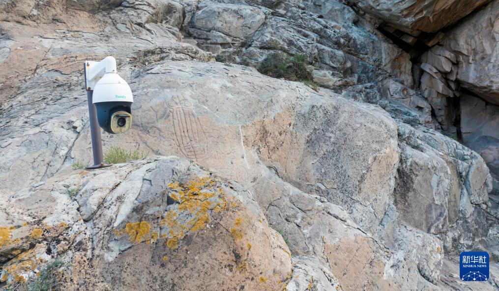 這是7月23日拍攝的賀蘭山巖畫景區的監控攝像頭(無人機照片)。目前,賀蘭山巖畫景區內有100多個監控攝像頭,對巖畫情況進行監控。