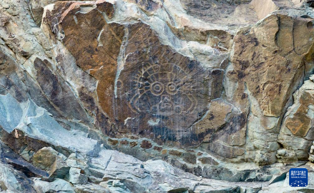 這是7月23日拍攝的賀蘭山巖畫景區內著名的標志性巖畫“太陽神”(無人機照片)。