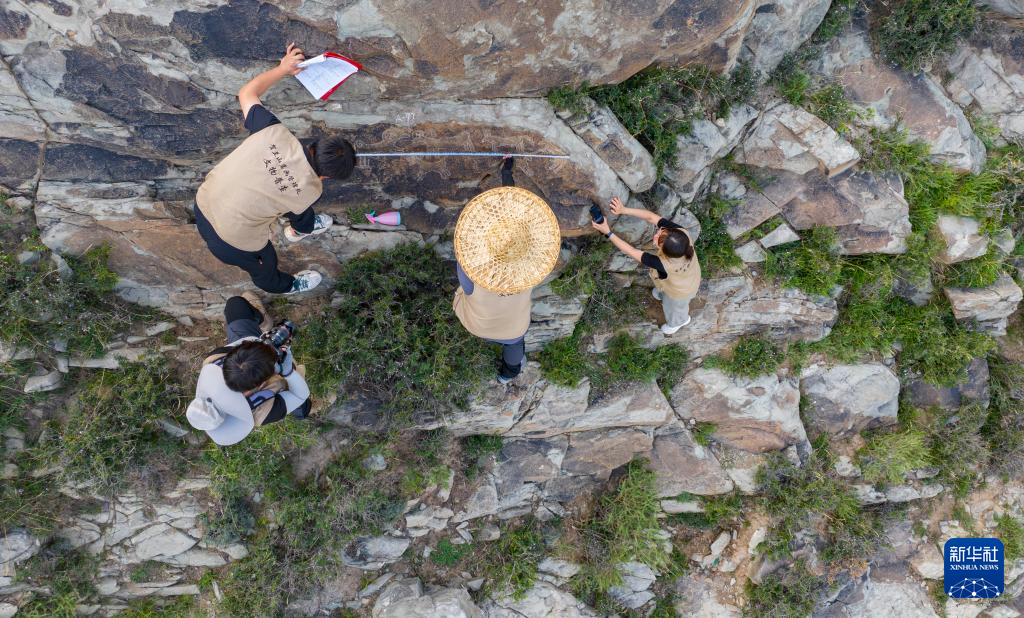 7月23日,工作人員在賀蘭山巖畫遺址區內進行2025年度巖畫復查(無人機照片)。