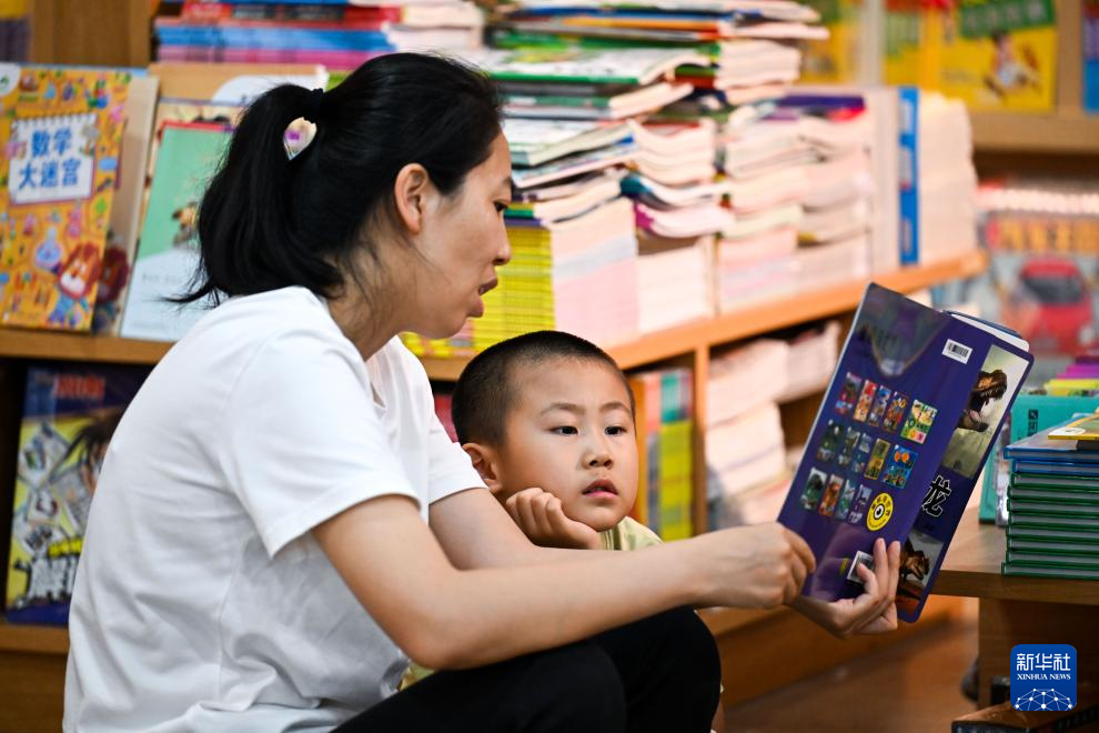7月27日,一位家長與小朋友在呼和浩特市青城閱立方書店閱讀。