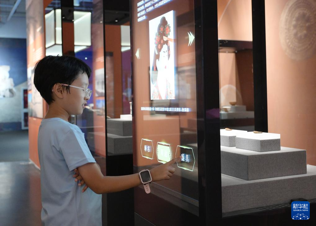 7月28日,一名小朋友在展廳內體驗文物智能展柜。