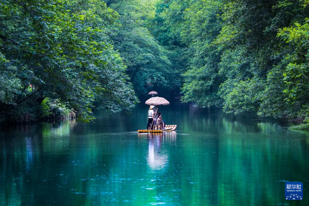 8月1日,游客在安徽省黃山市徽州區西溪南景區乘坐竹筏游玩納涼。