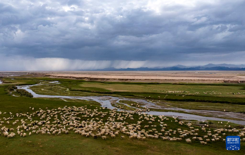 7月12日,在甘肅省阿克塞哈薩克族自治縣阿勒騰鄉哈爾騰村,羊群在夏日牧場吃草,遠處正在降雨(無人機照片)。