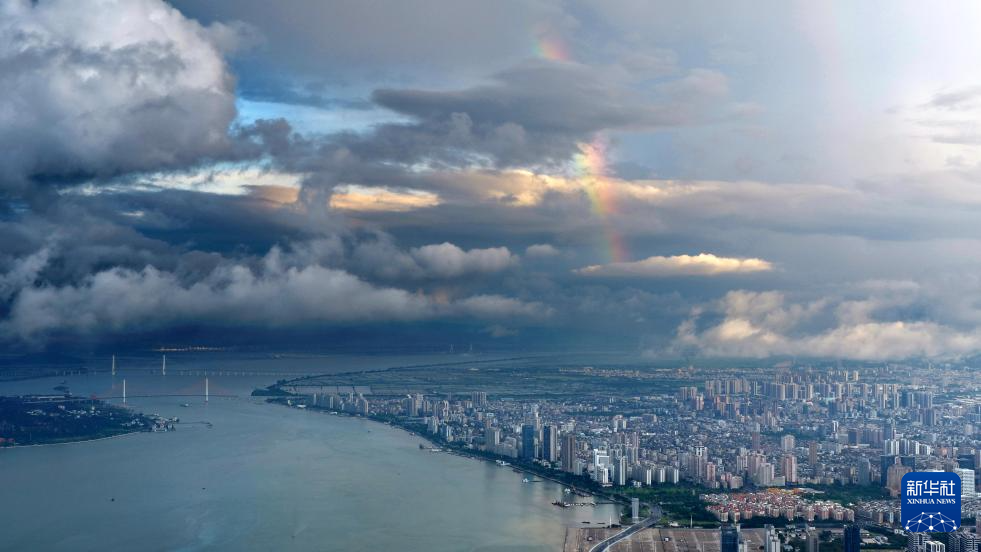 6月30日,在廣東汕頭城市上空,雨后出現彩虹(無人機照片)。