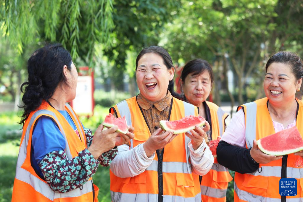 7月22日,河北省唐山市豐潤區環衛工人分享志愿者送來的西瓜。