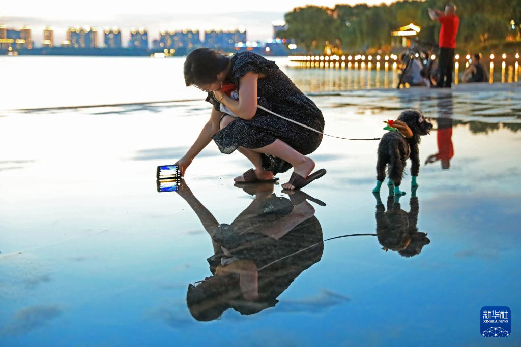 6月30日傍晚,在江蘇省宜興市團氿之濱,市民用手機貼近積水地面拍攝大雨過后的景象。