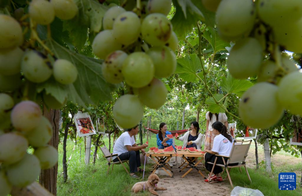 8月2日,在河南省商丘市夏邑縣太平鎮,人們在葡萄架下吃瓜休閑,避暑消夏。