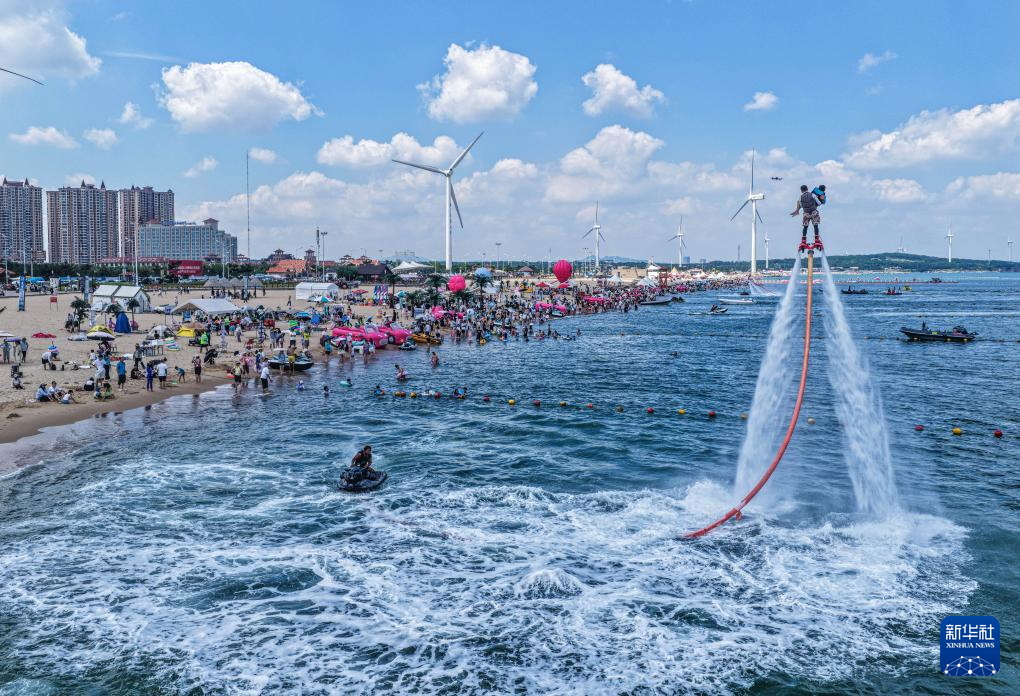 7月24日,在山東省榮成市那香海國際旅游度假區,游客體驗“水上飛人”(無人機照片)。