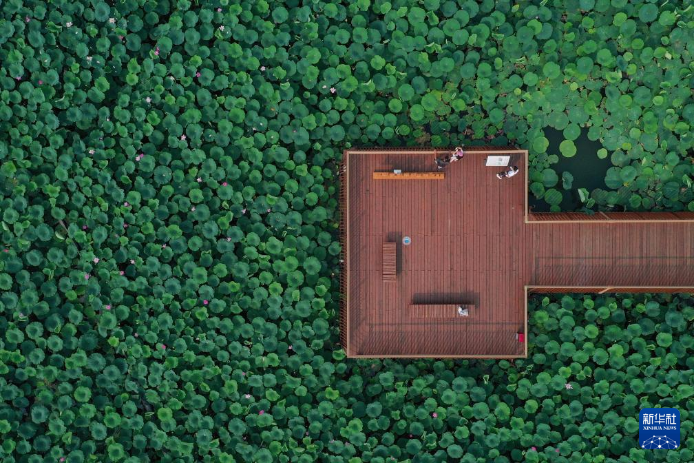 7月10日,游人在江蘇南京玄武湖公園賞荷(無人機照片)。