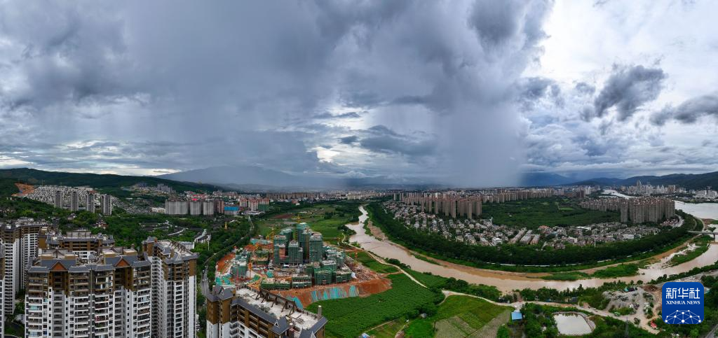 7月7日在云南省西雙版納傣族自治州景洪市拍攝的雨中景觀(無人機全景照片)。