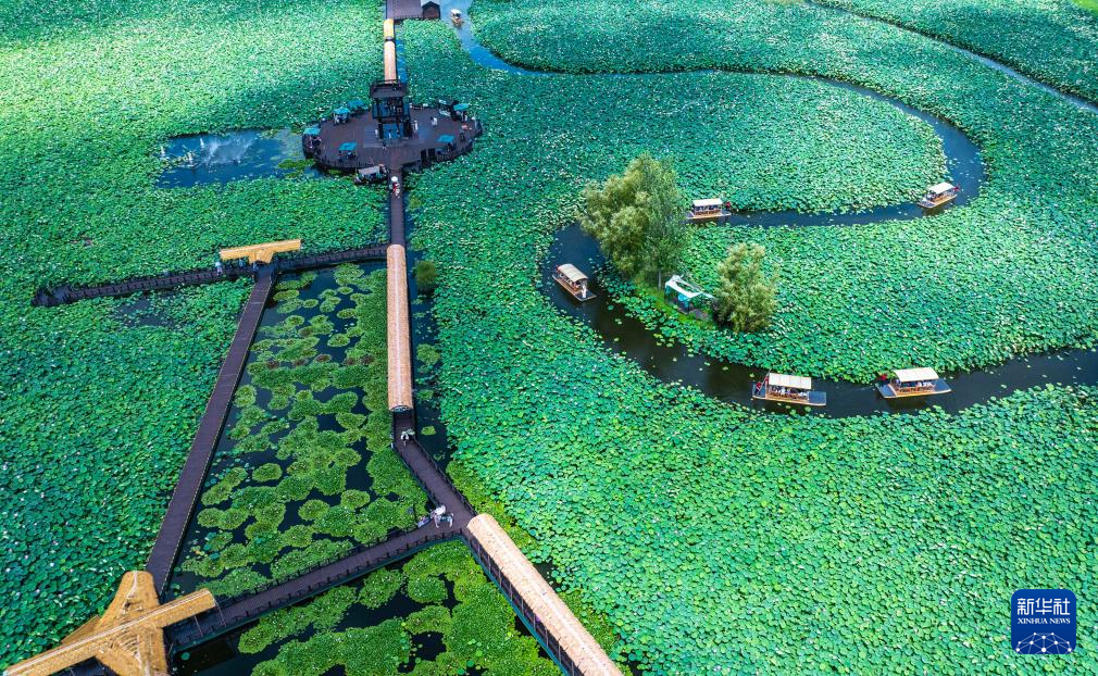 7月21日,游客在江蘇省興化市萬畝荷塘景區賞荷游玩(無人機照片)。