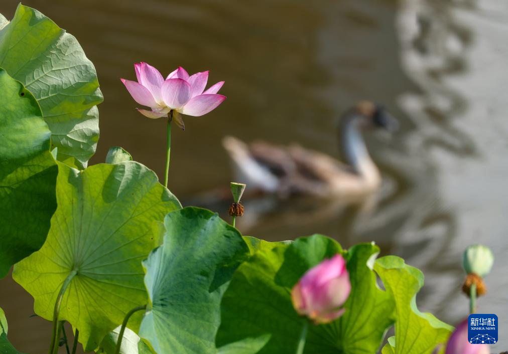 7月7日,在貴州省銅仁市玉屏侗族自治縣皂角坪街道枹木垅村,一只鵝從荷花旁游過。