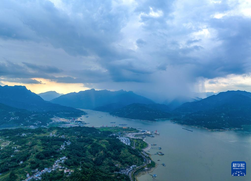 7月28日傍晚,長江三峽湖北省宜昌市秭歸縣水域附近呈現“東晴西雨”景觀(無人機照片)。