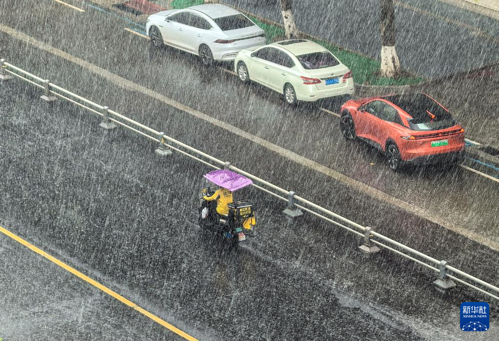 7月23日,在四川省遂寧市船山區,外賣配送員冒雨騎行。