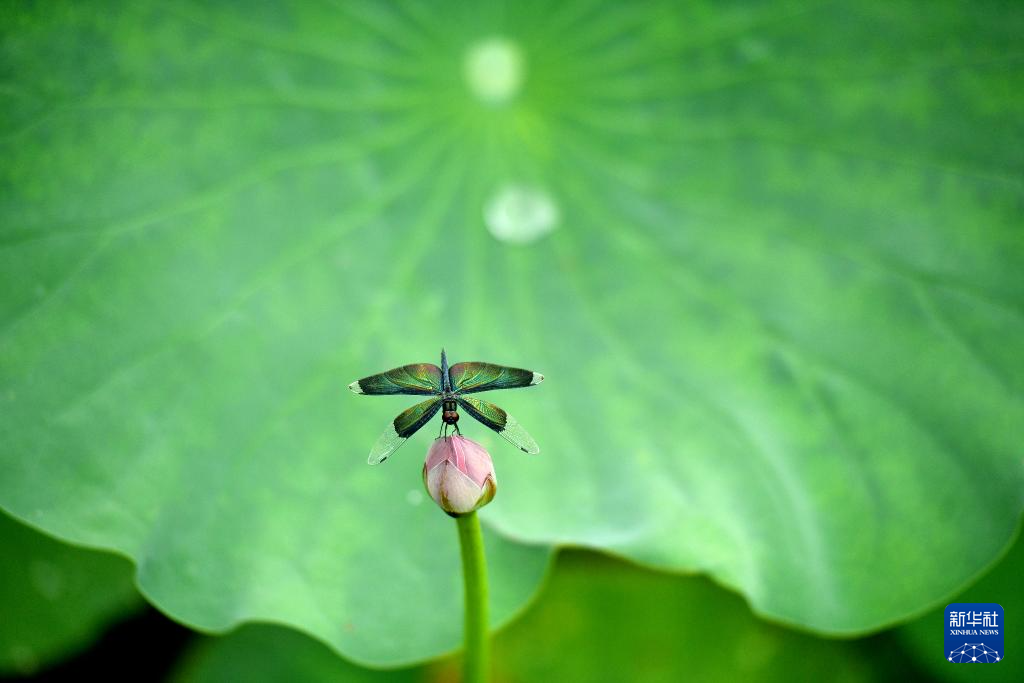 7月1日,在河北滄州獅城公園,一只蜻蜓停留在荷花花苞上。