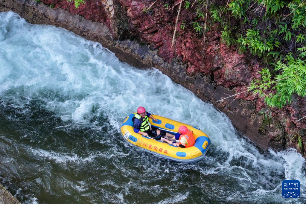 7月26日,在廣西欽州市八寨溝景區,游客體驗漂流(無人機照片)。