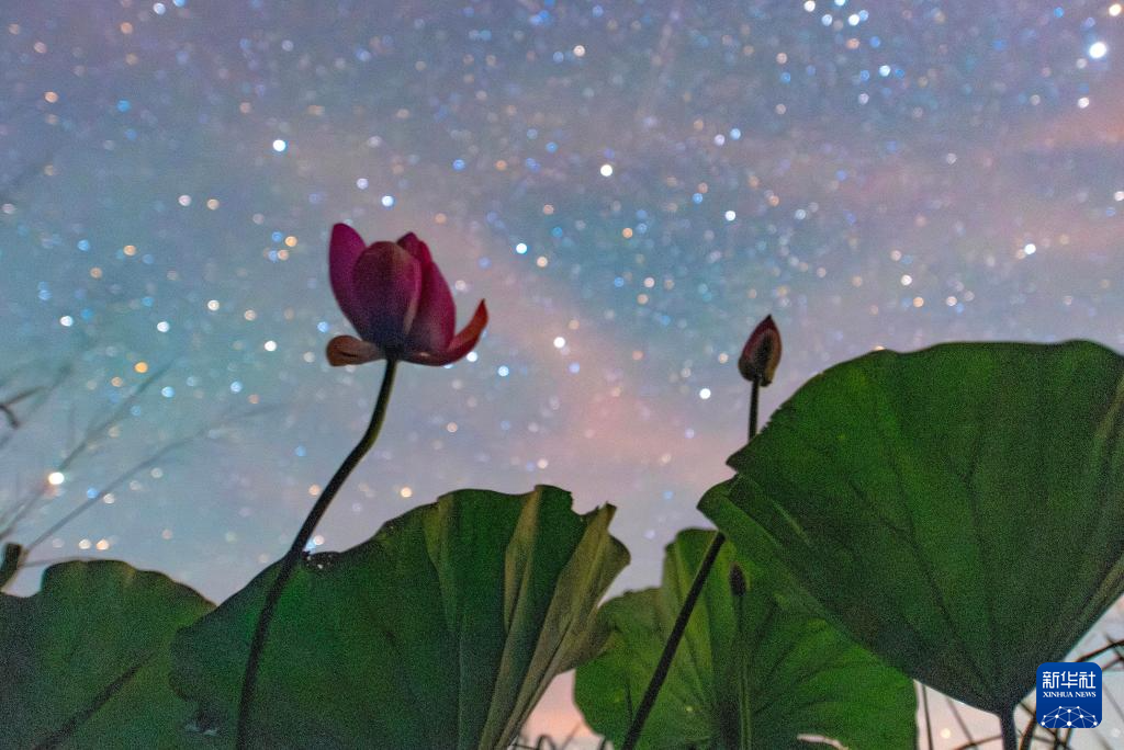 8月4日在位于黑龍江省富錦市的黑龍江三環泡國家級自然保護區拍攝的星空下的荷花。