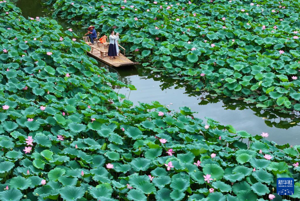 7月22日,游客在安徽省黃山市徽州區呈坎古村落游玩賞荷(無人機照片)。