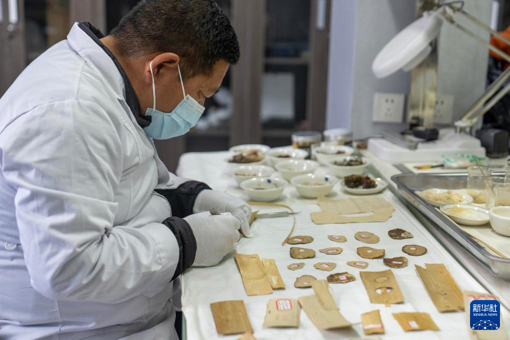 布達拉宮貝葉經實驗性修復小組實驗室工作人員對貝葉進行處理(2025年5月25日攝)。新華社記者 旦增尼瑪曲珠 攝