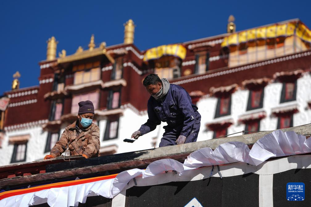 布達拉宮管理處維修科工作人員在粉刷墻體(2024年12月4日攝)。新華社記者 晉美多吉 攝