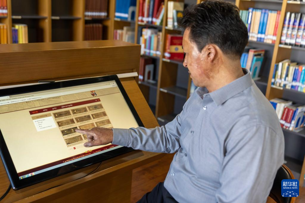 西藏自治區圖書館副館長邊巴次仁介紹數據庫中的藏文古籍(2025年8月13日攝)。新華社記者 旦增尼瑪曲珠 攝