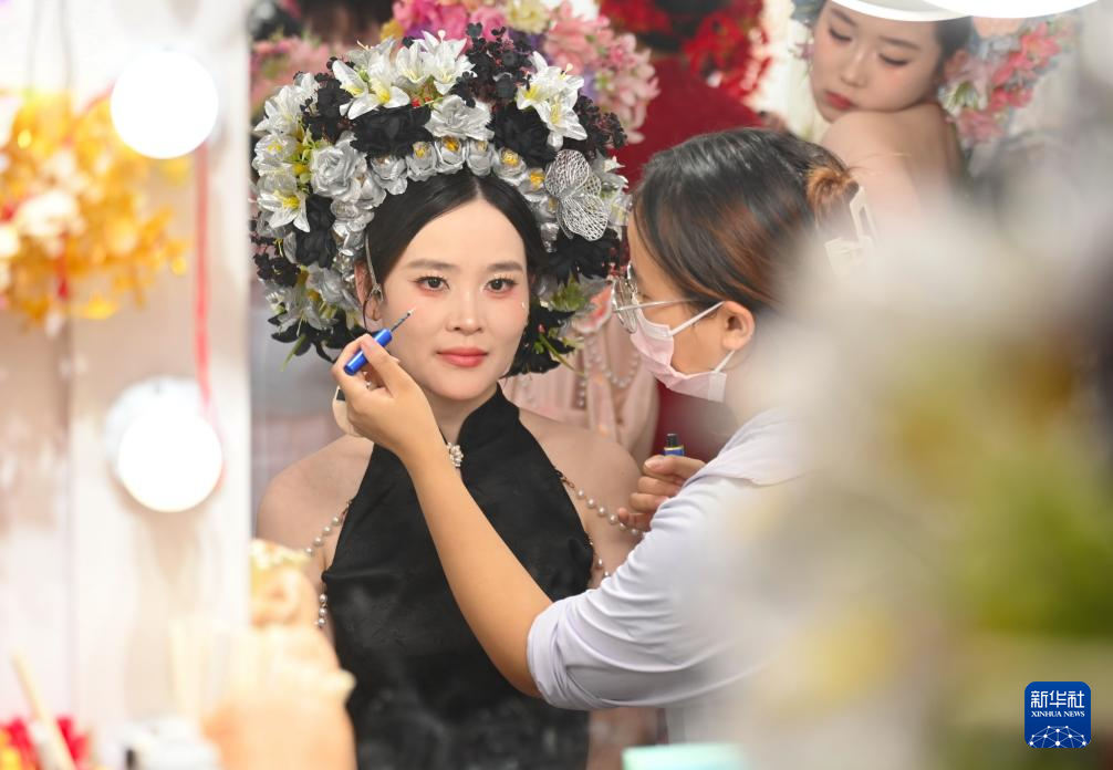 8月18日,來自廈門的游客在泉州市蟳埔村的一家簪花旅拍店化妝。