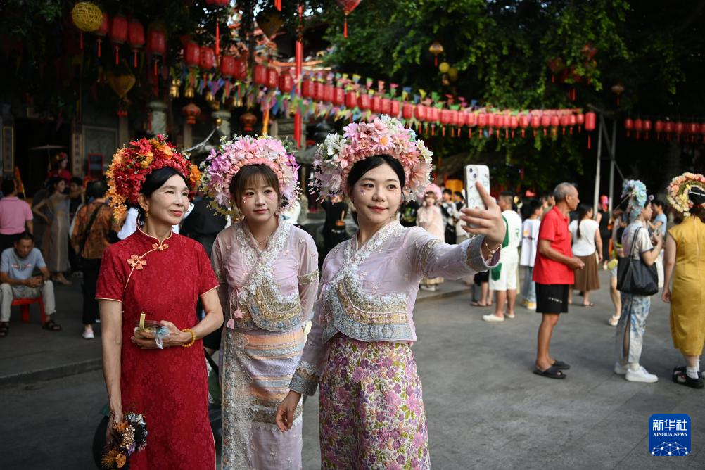 8月18日,福建泉州蟳埔村,體驗“簪花圍”的游客在拍照留念。