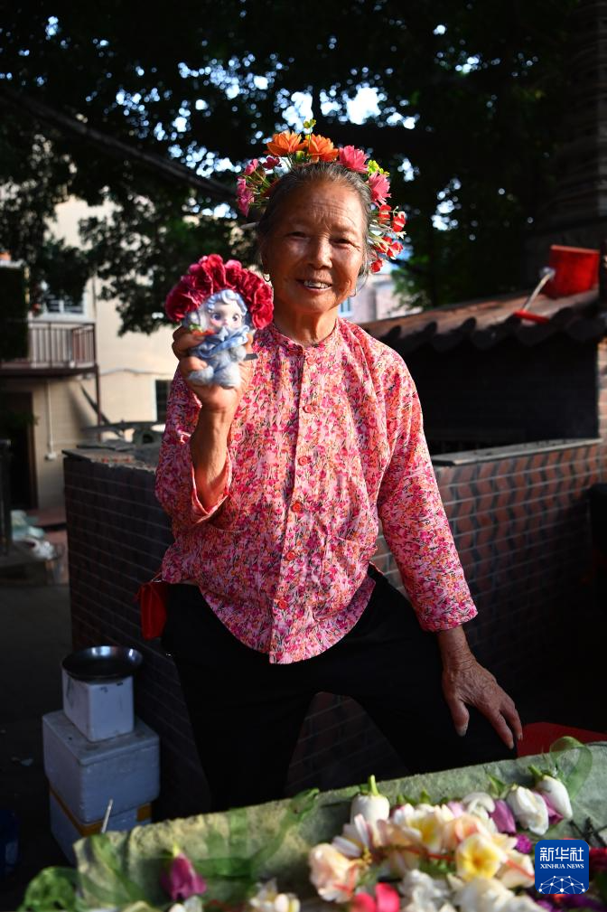 8月18日,福建泉州蟳埔村,一名蟳埔女在展示簪好花圍的毛絨玩具。