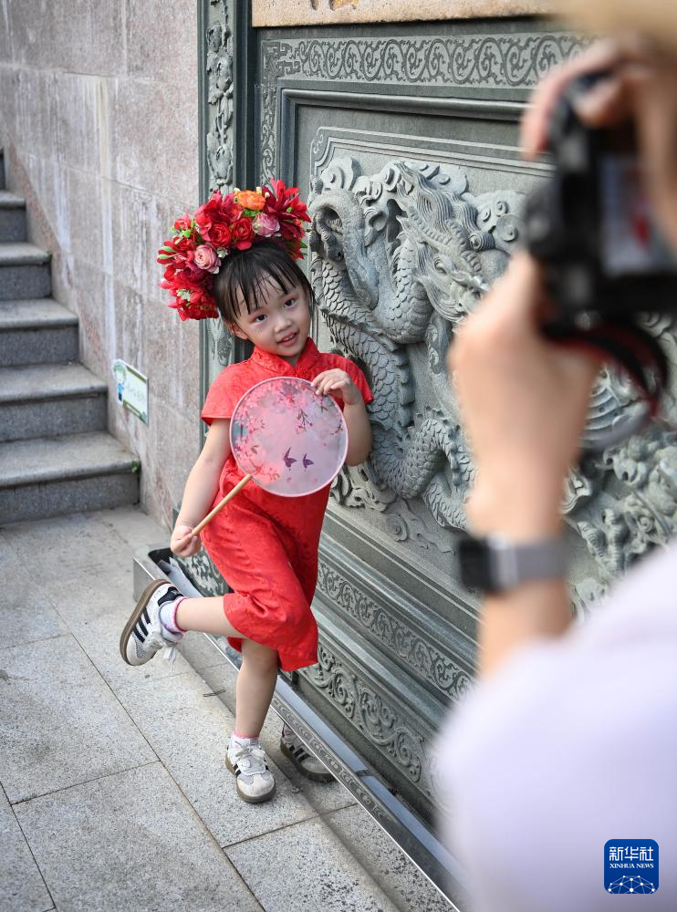 8月18日,福建泉州蟳埔村,一名體驗“簪花圍”的小游客在拍照留念。