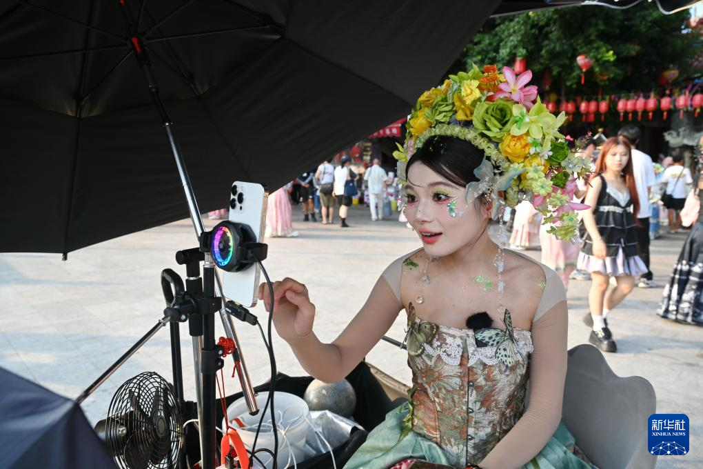 8月18日,福建泉州蟳埔村,工作人員通過手機直播為游客介紹“簪花圍”旅拍業務。