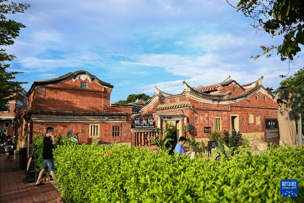 8月19日,游客在福建晉江梧林村紅磚古厝前拍照。