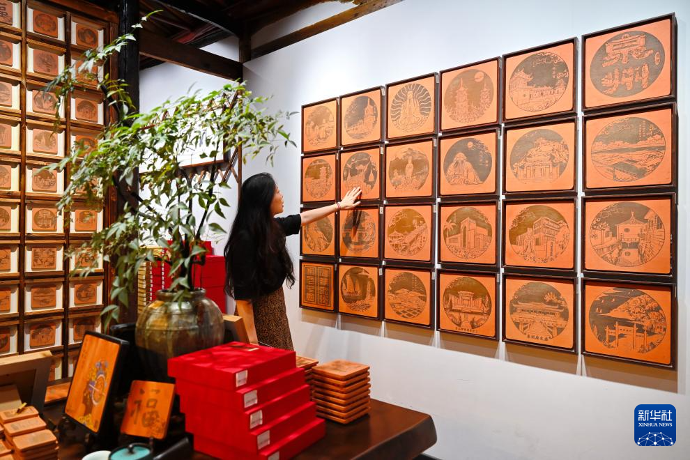 8月19日,在福建晉江梧林村,一家工藝品店經營者在介紹閩南紅磚雕藝術品。