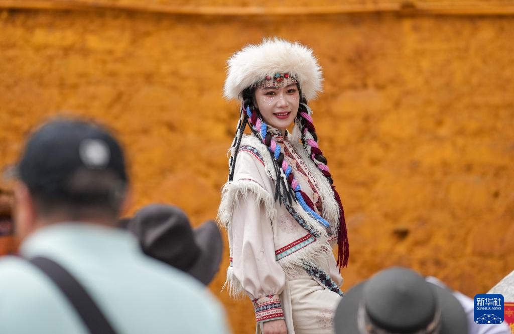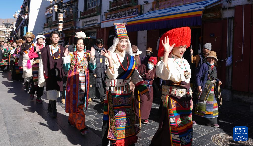 模特在拉薩八廓街“繁飾自然·衣彩拉薩——拉薩新年服飾秀”活動中巡游(2025年1月3日攝)。