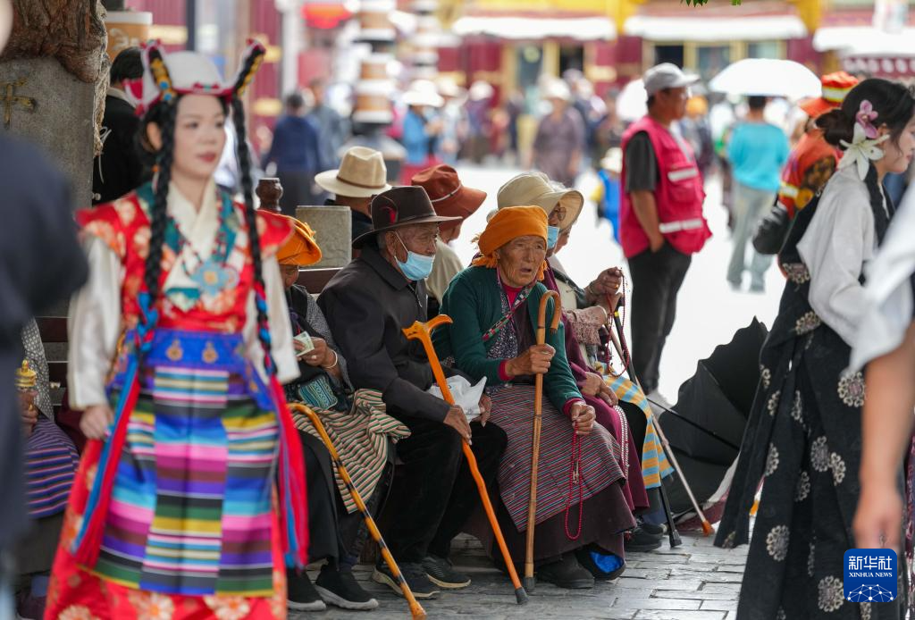 8月19日在拉薩老城區拍攝的身著藏裝的游客和正在休息的本地市民。